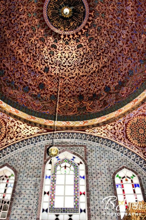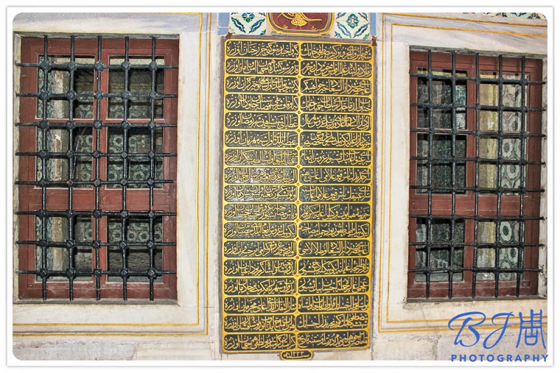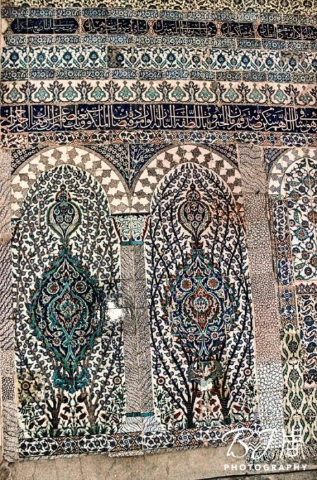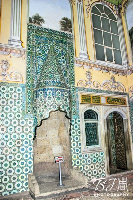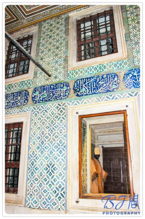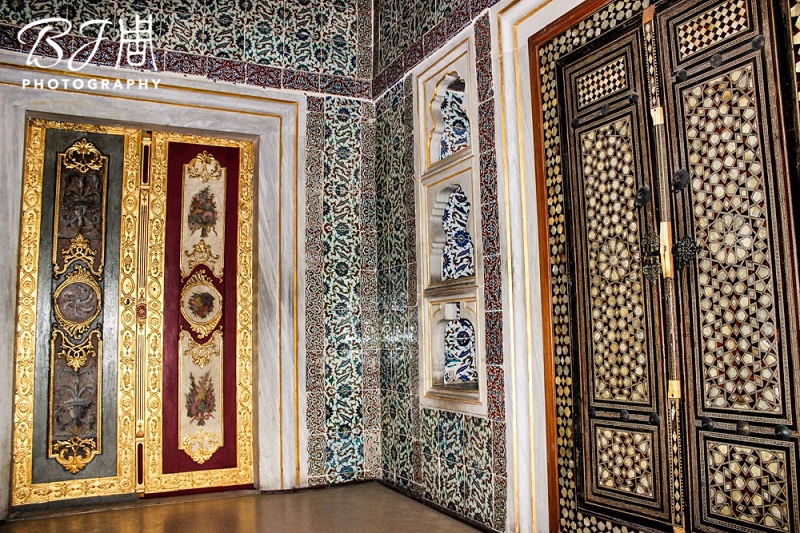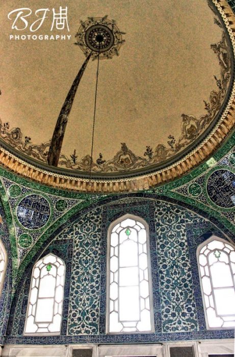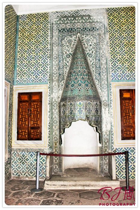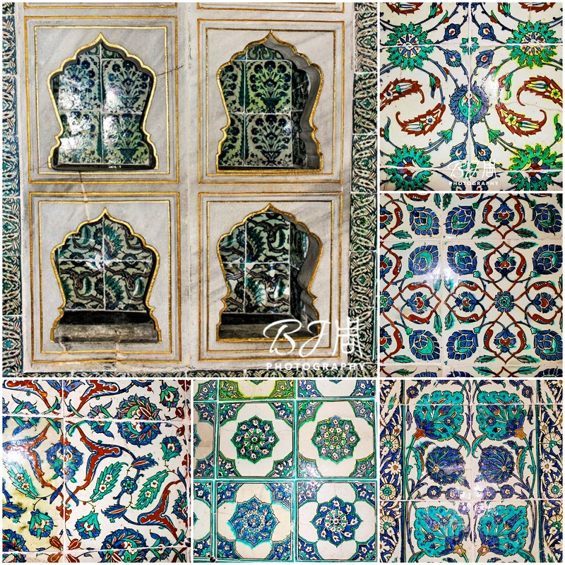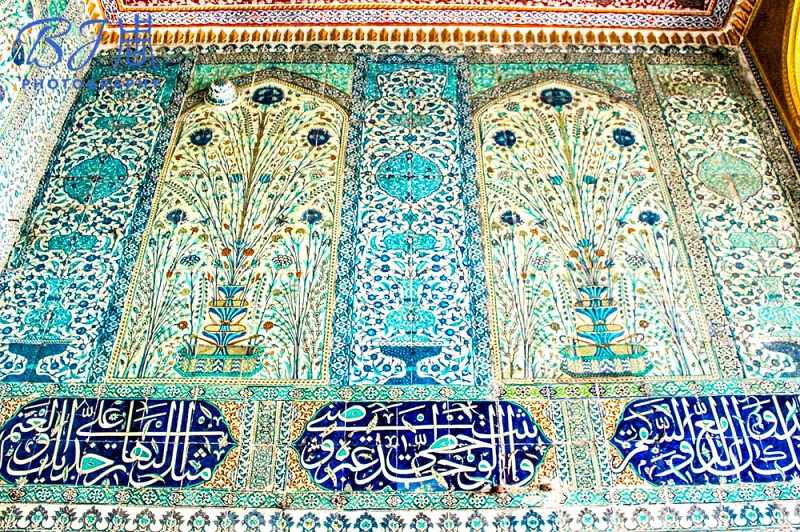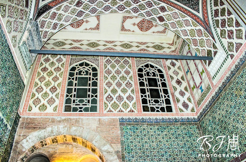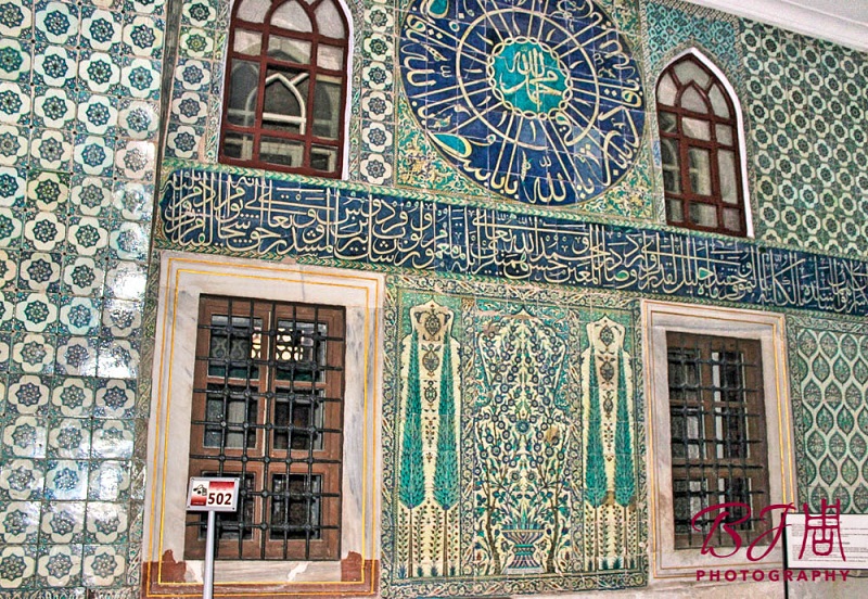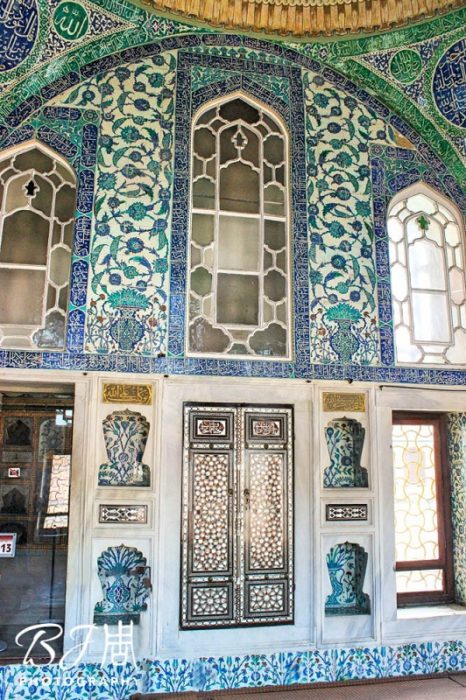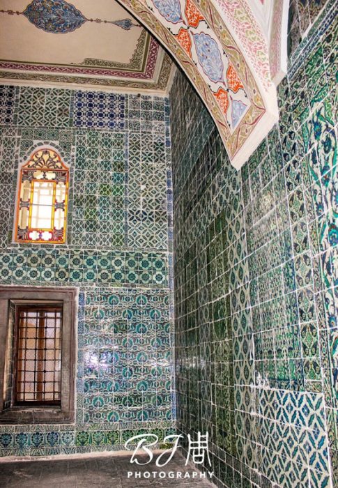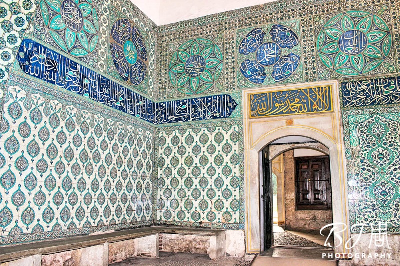 托卡比皇宮貼滿了華麗繽紛的彩釉磁磚,後宮裡更是讓人眼花撩亂,磁磚花色千百不一,彌補了雕樑畫棟的不足。這些各色各樣的磁磚拼在一起,繁複精細讓人看了覺得驚異。