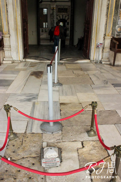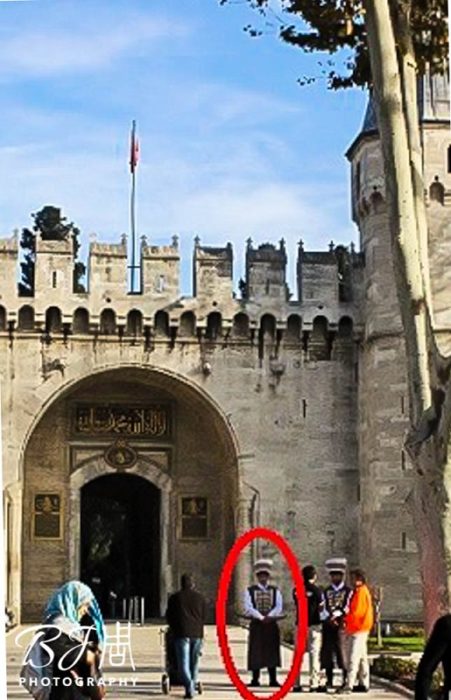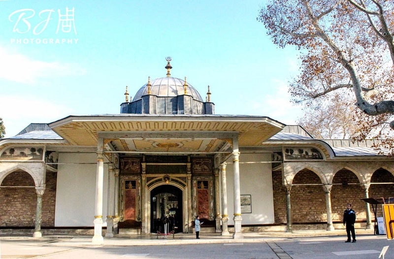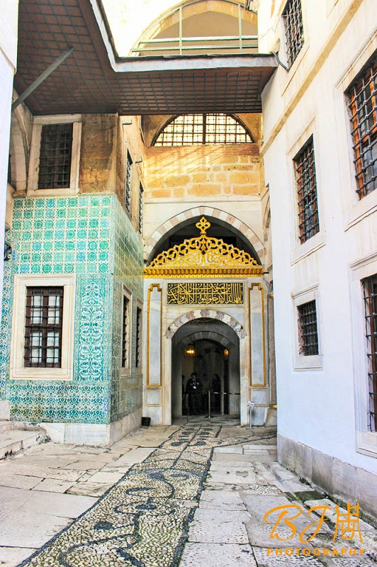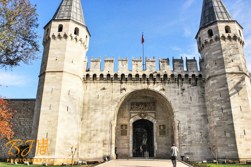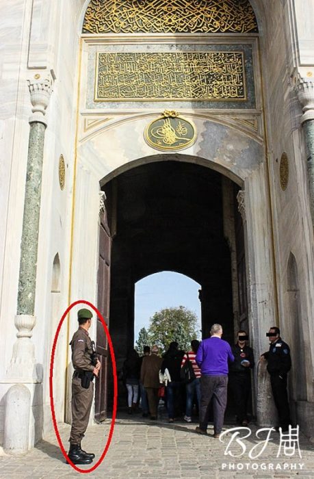 進入皇宮要通過三道門關,在第一道「帝王之門」前,有身著鄂圖曼禁衛軍制服的警衛,出口處則有持槍的現代土耳其警衛,這樣的安排形成了強烈對比。請注意看門上有蘇丹簽名和皇家圖案,這是對人民敞開大門的意思。