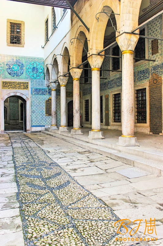 上圖中這個院落就是皇后寵妃專用,與妾房封閉的庭院最大不同是,它有一面開放可以眺望海峽。托卡比皇宮本是一座居高臨下的衛城,矗立在一個將金角灣和馬爾馬拉海分開的岬角上,可說是近海的最高點,視野當然不比一般。