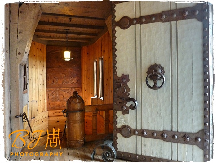 山上氣候變化莫測,風大雪大,窗子可以關緊,進出木屋的大門不得不都做得比較小,而且用手工斧劈砍磨製成,相當厚實沉重,關開皆不容易。支撐建築的主樑根根又粗又大,中庭的六角形石砌壁爐加煙囪高達27公尺(下圖),整體給人的感覺就是「粗曠」,內部又比外觀更與周圍的大自然搭調。