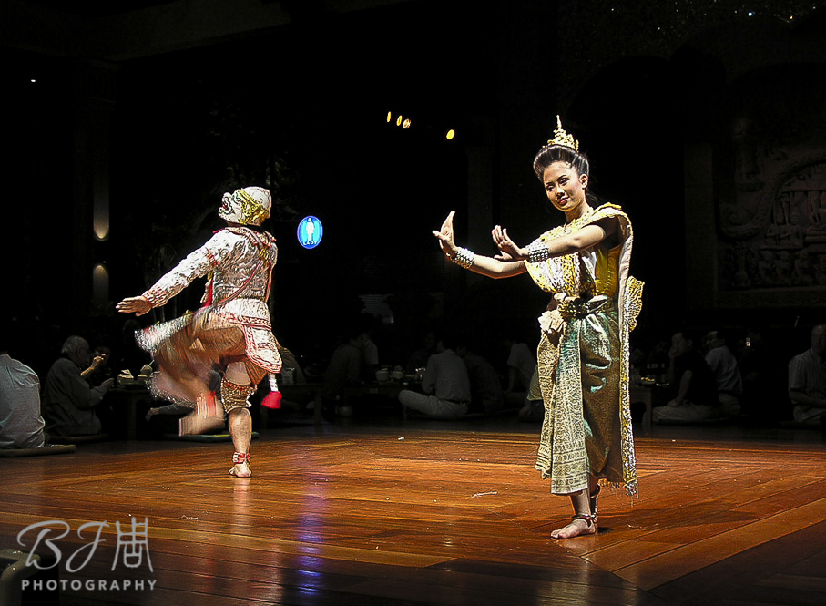 既是帝王饗宴,嘴裡吃著美味,還要有歌舞助興。除了傳統的民俗舞蹈和鼓樂演奏(上圖),竟還有一段“哈奴曼” (Hanuman) 的「倥」舞(Khon)。這可不是隨便走進一家泰國餐廳就能看到。