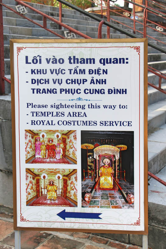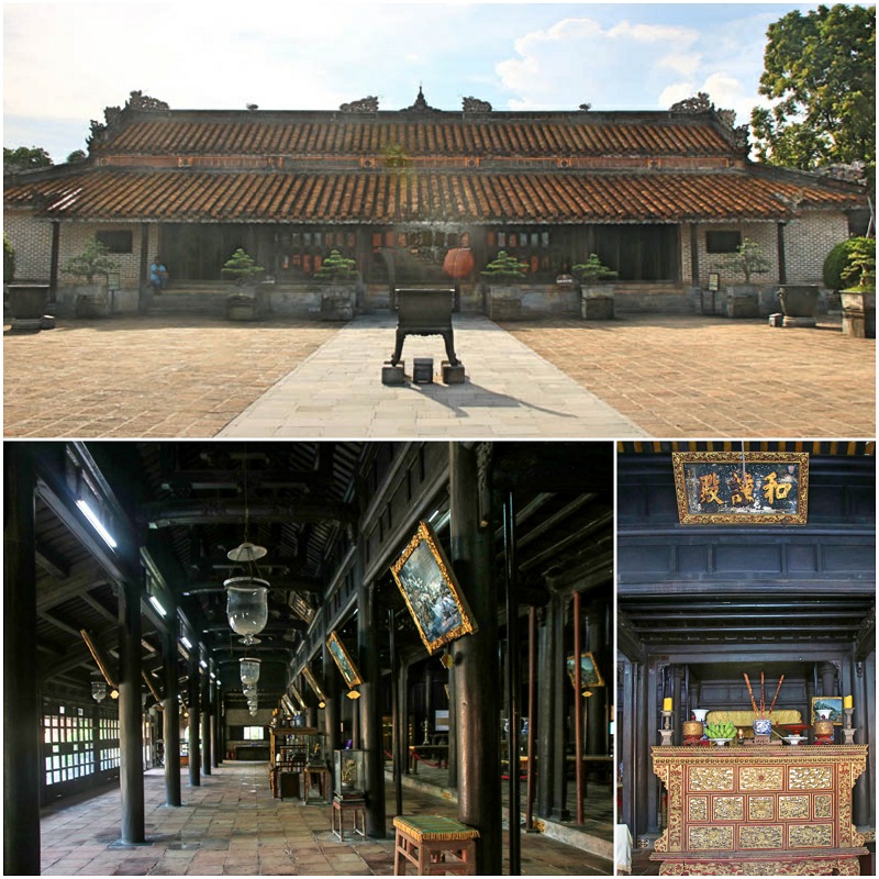 上述園林區之外,又分成寢殿區和陵墓區兩大塊,寢殿區的和謙殿原是嗣德帝的辦公處,現在安置牌位祭祀皇帝及皇后,和謙殿後面是良謙殿,原是嗣德帝的寢宮,現在改做祭祀皇太母以及展示皇家文物。這裡還有兩張寶座,花點小錢就能穿扮成皇帝皇后坐在寶座上拍照。