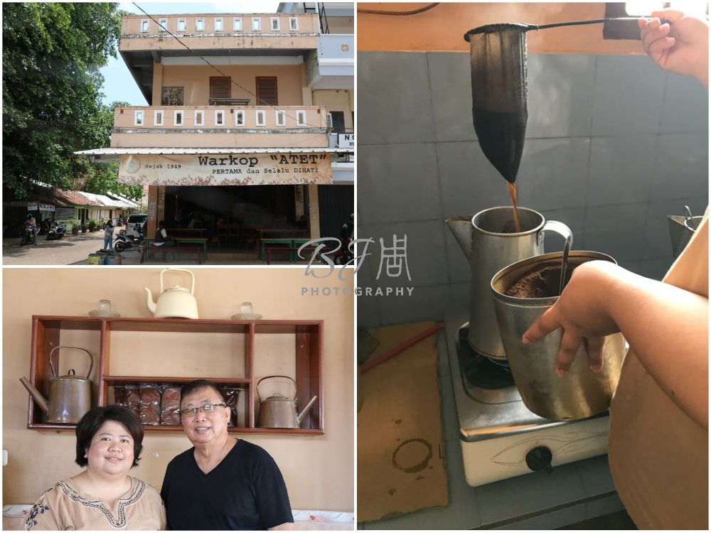 第二天上午十點趕到現場,果然街上人聲鼎沸,顧客三五成群或閒坐席間,或喝著咖啡聊天,走進一間元老級的咖啡店Warkop ATET,我點了一杯招牌咖啡,看著店家用傳統方法調製,喝進嘴裡覺得綿密香醇,口味比西部咖啡清淡一點。