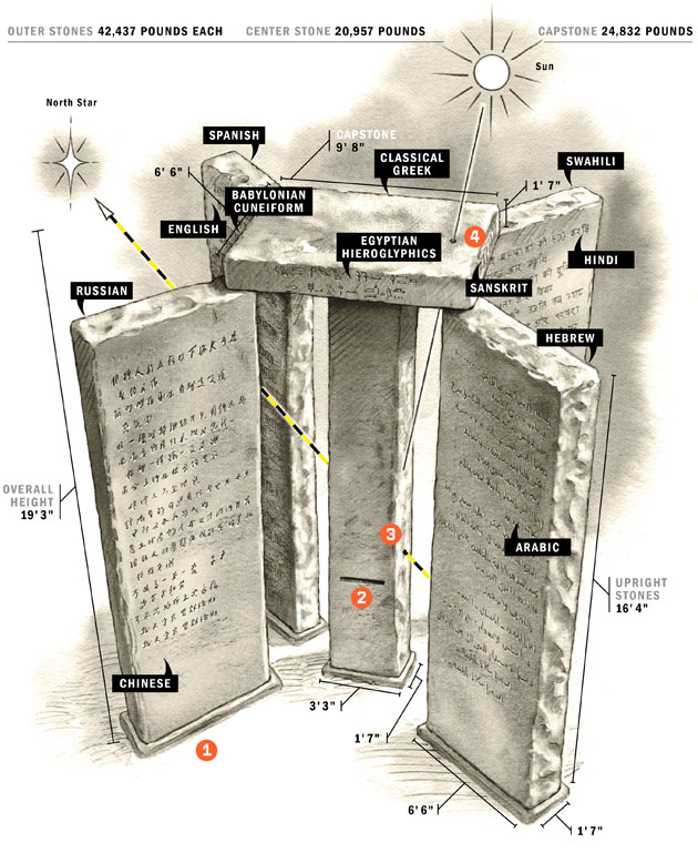 「指引石紀念碑」於1980年出現在世人眼前,據說是一位用匿名R.C. Christine的人,自稱代表“一小群信仰上帝的忠誠美國人”,委託承包商製造一個可以向全世界傳遞訊息的石碑。