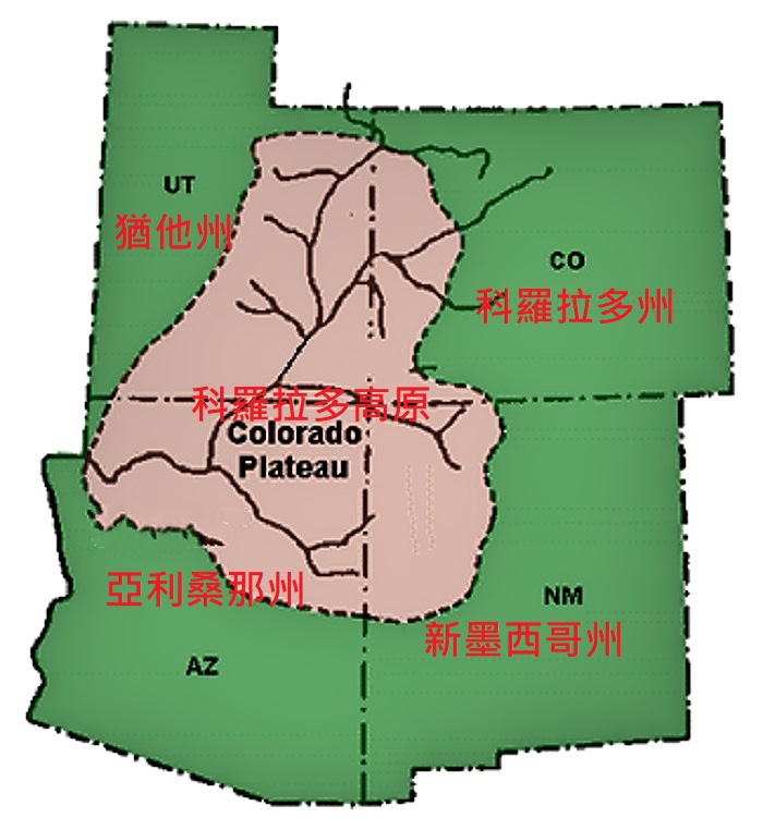 古老的科羅拉多高原,主要由山脈地貌和沙漠地區組成,面積佔了科羅拉多州西部、新墨西哥州西北部、猶他州南部和東部、亞利桑那州北部,以及內華達州最東南部的一小部分,整體來看是一個四角地區。