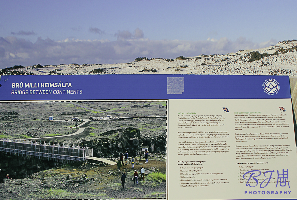 站在大陸橋上,是觀察板塊構造運作的絕佳地點,橋中間有一塊牌子寫著「Midlina」(中線的意思),你可以一腳踏在歐洲、一腳踏在北美洲打卡,也可以一秒從歐洲步行到北美!