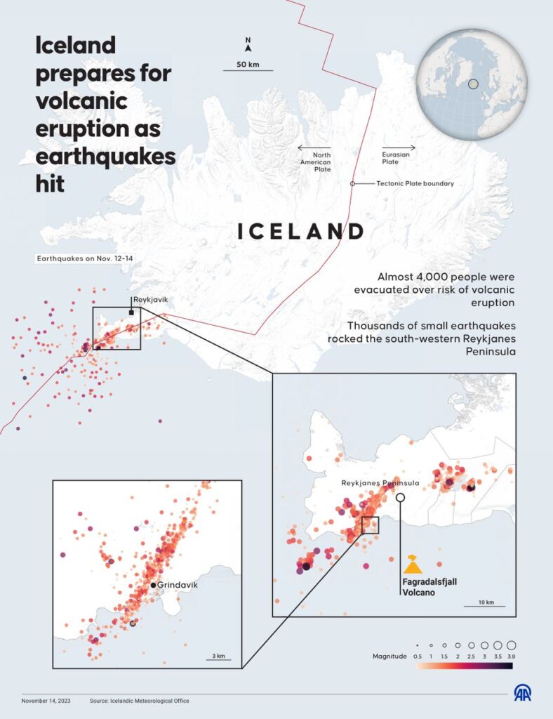 距離火山12公里的格林達維克(Grindavik)小鎮,部分地面已經上升了約三英尺,也有些地面陷落,許多房屋受損,路上裂縫狂冒有毒氣體,景象觸目驚心。
