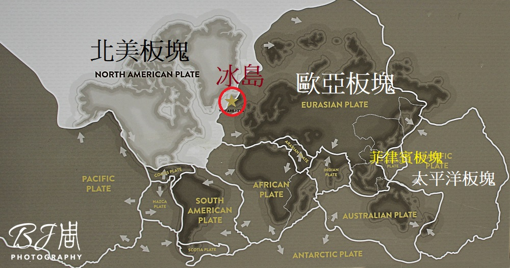 冰島則是在兩大主要板塊的交界處。而且是在主要板塊當中,最大的兩個板塊(北美和歐亞)交會處。