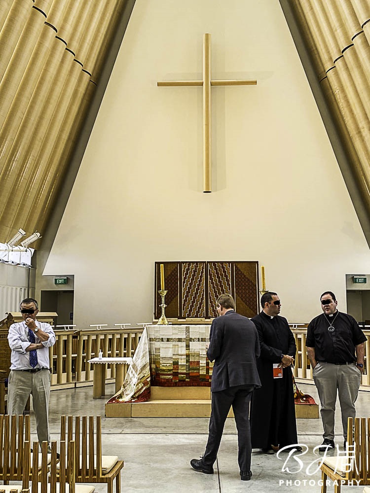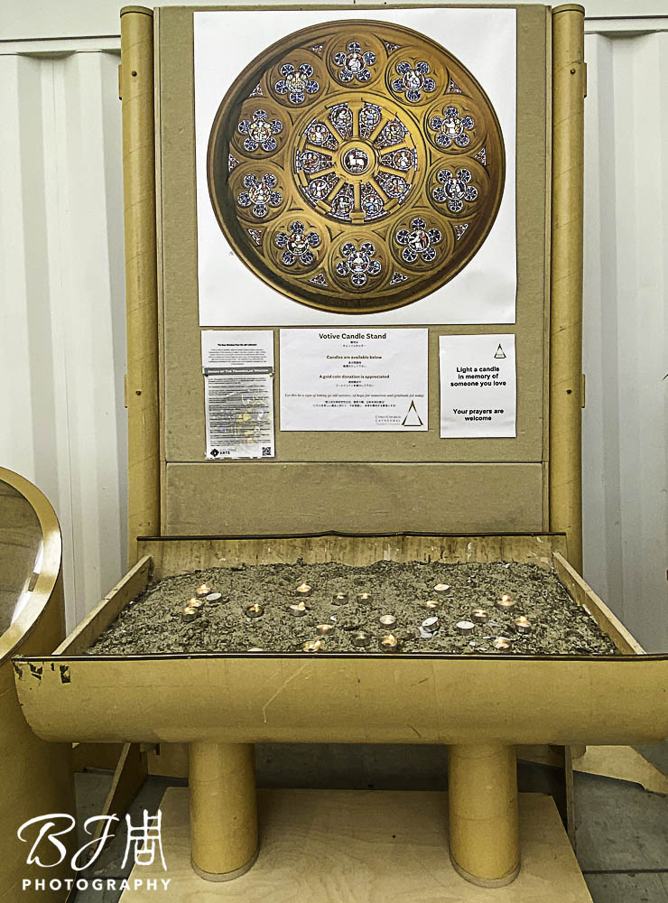 教堂最初設計是全部以紙板管為結構組件,但因當地製造商無法生產足夠厚的管子,進口紙板又被拒絕,最後牆壁是用混凝土板+貨櫃板面組成。