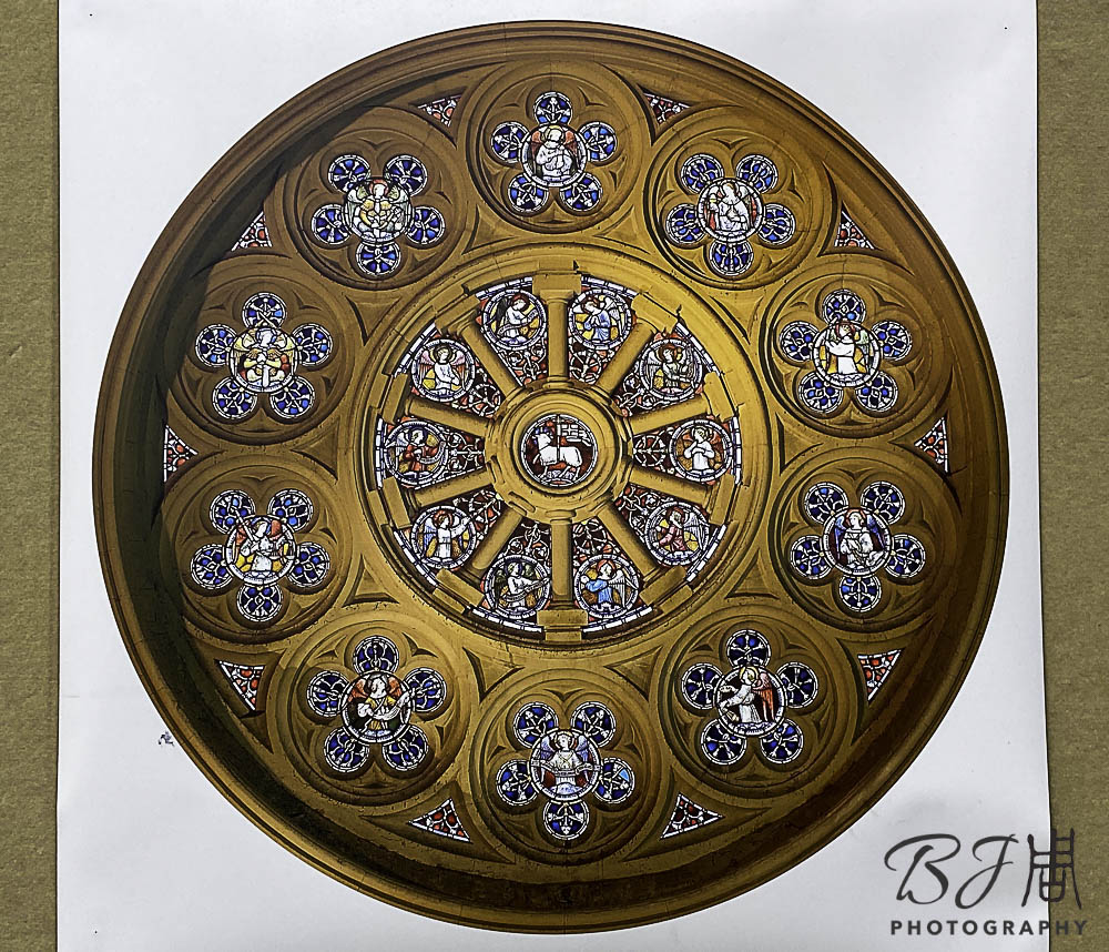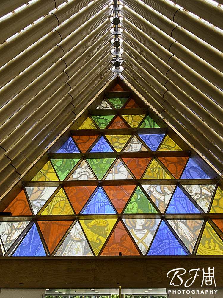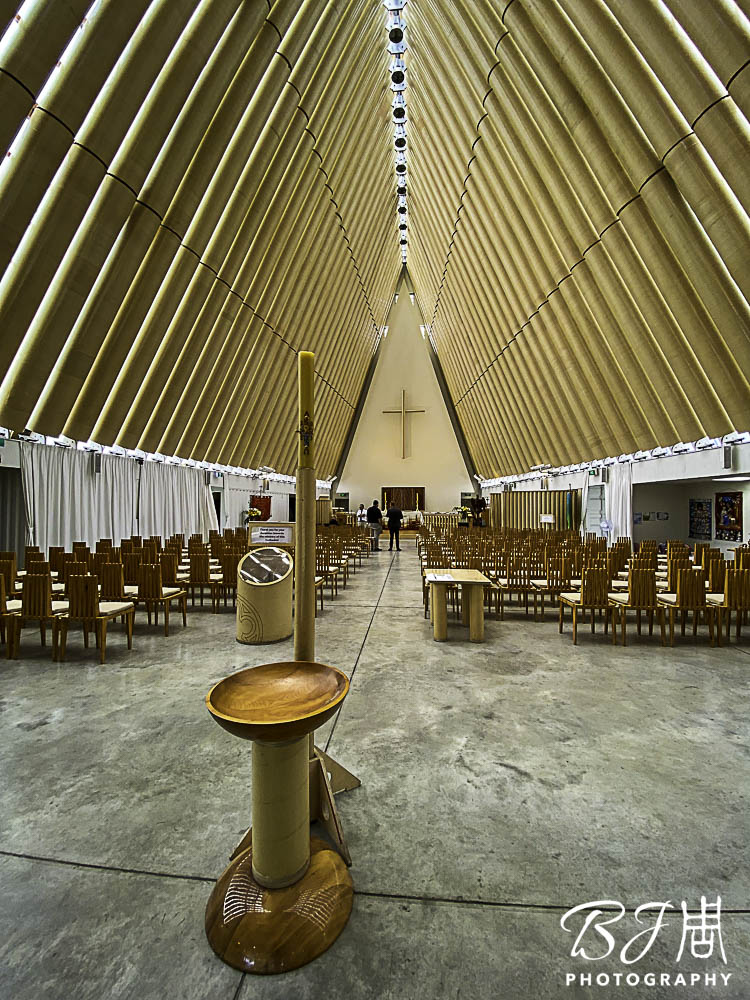 教堂一頭牆面上是紙管合成的十字架,另一頭牆面上是三角形的彩色玻璃花窗,教堂中擺設的椅子,椅背呈條管狀,與舉頭觸目的屋頂合為一體。