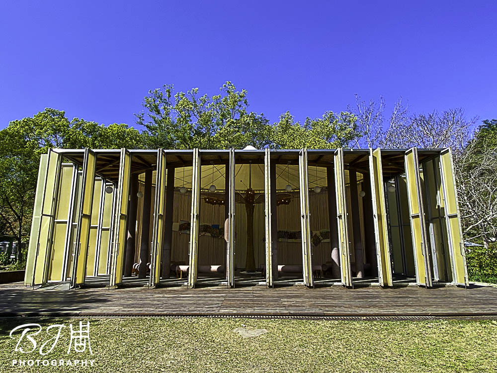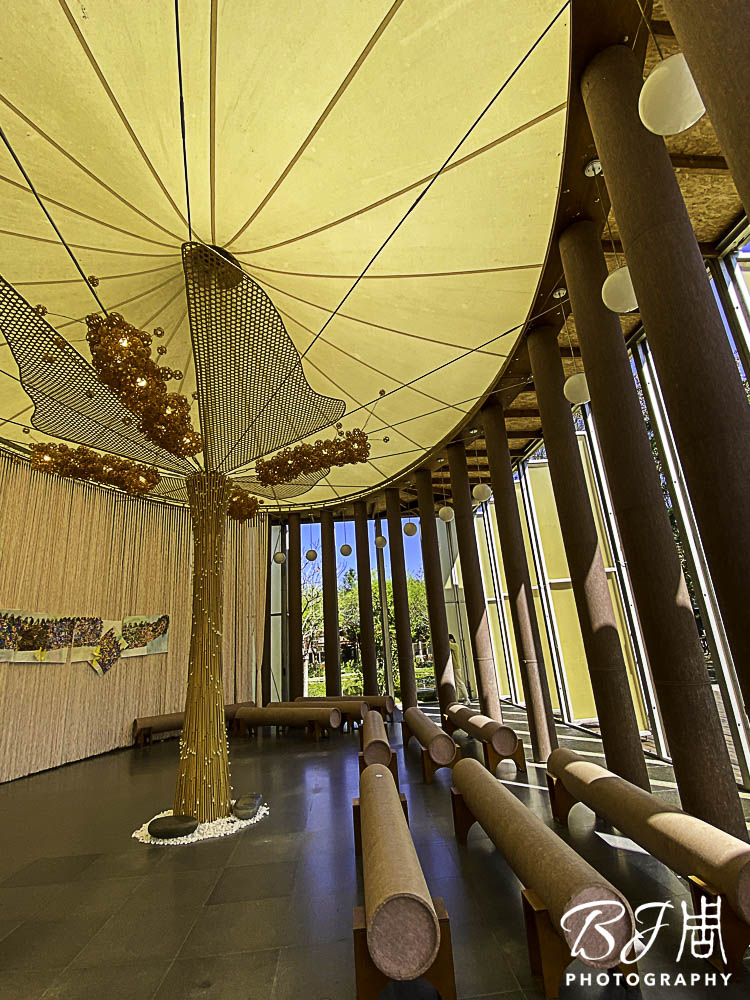 異邦遠來的紙教堂,用58根紙管支撐建築本體,外牆則以玻璃纖維浪板構築成落地窗牖與長方形迴廊,呼應內部微微透光的橢圓形天幕,營造出敬天親人的靜穆氛圍。