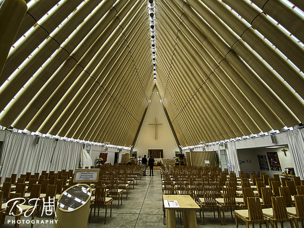 基督城紙教堂(Cardboard Cathedral)的外觀吸睛,仿佛矗立在地面上的一座金字塔,走進教堂內部才會發現屋頂由96根紙板管呈Λ型高高聳起,管子之間有兩英寸的間隙,以便光線可以透射內部。