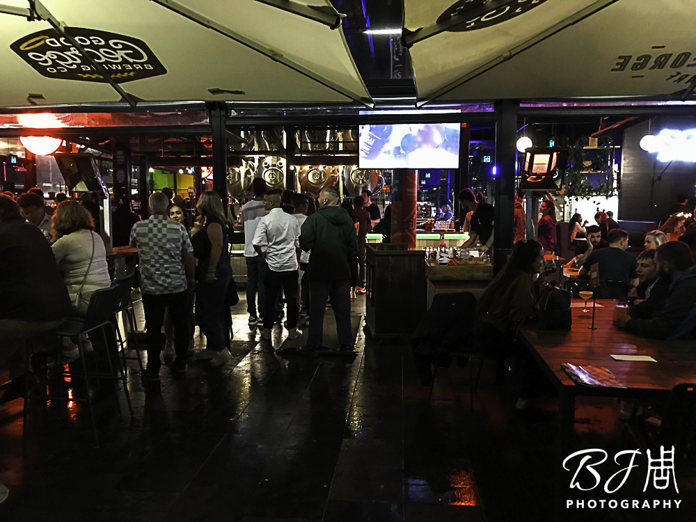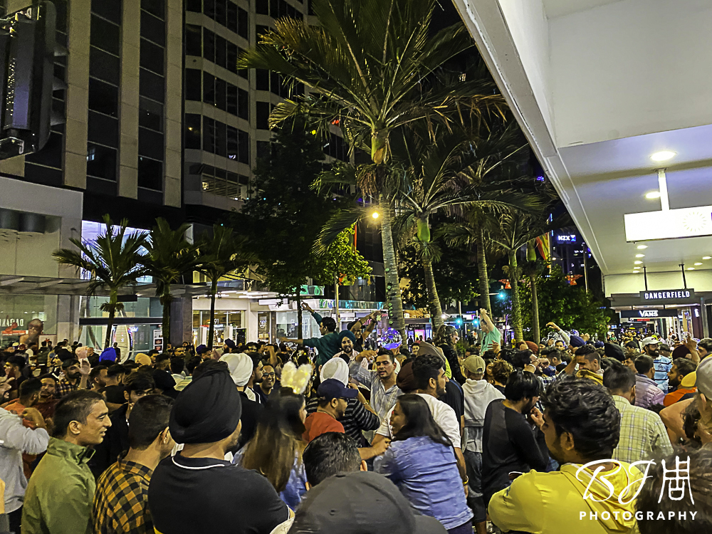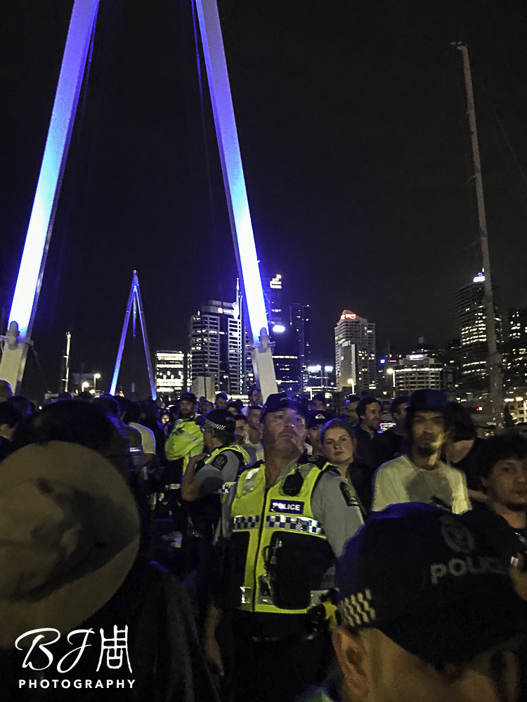 從卡蘭加廣場步行回市中心,走上渡橋到對岸,本來是雙向通行,此時全部湧往出口方向,中央站著一排警察維持行進秩序,停泊港灣的遊艇上還在舉行著派對狂歡,迴盪的音樂和交錯的身影彷彿宣告「歲月匆匆過,人生當盡歡」。
