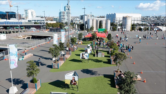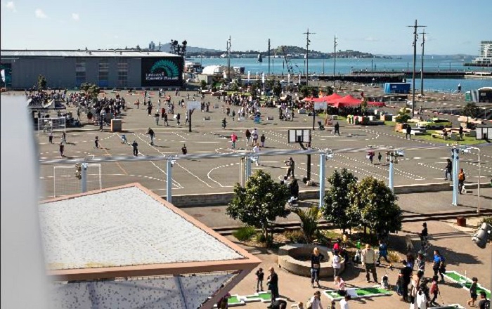 廣場上有貨櫃裝置的資訊亭,平日擺放可以在軌道上移動的躺椅,假日或節慶則在廣場上舉辦活動和表演。附近還有紐西蘭海事博物館可供參觀。