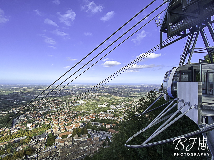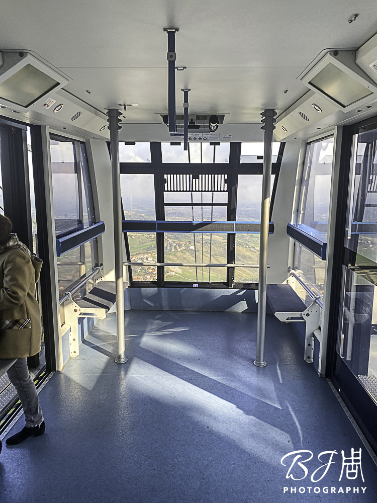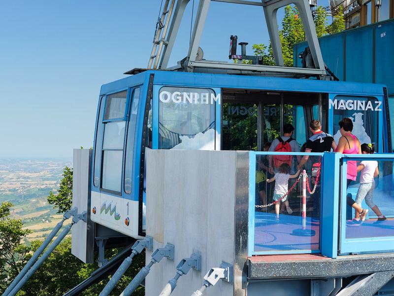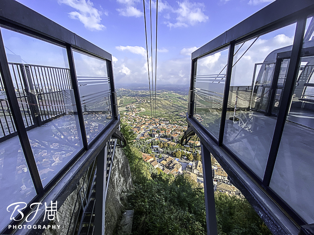 纜車四面透明,從博爾戈馬焦雷到聖馬利諾歷史中心大約 2 分鐘,居高望遠的旅程上,可以眺見 200 多公里的亞得里亞海海岸。