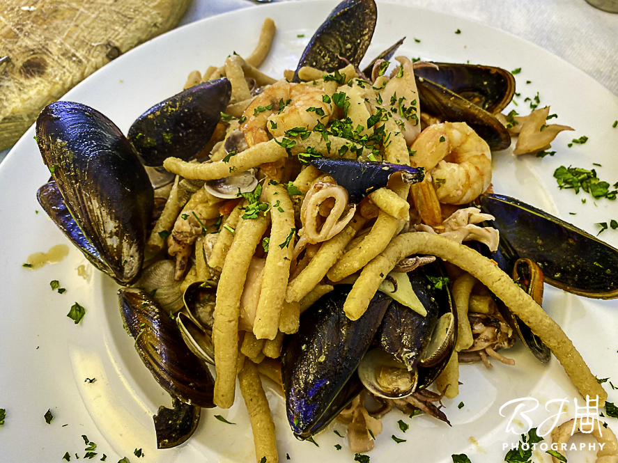 晚餐吃了他們的Trofie allo scoglio,這是一種義大利海鮮麵,發現大失策,完全不是我在山下里米尼吃到的那樣銷魂,趕緊加點一份薄皮Pizza填飽肚子。幸好點了紅白兩杯聖馬利諾國酒Biancale來品嘗,稍許彌補了遺憾。
