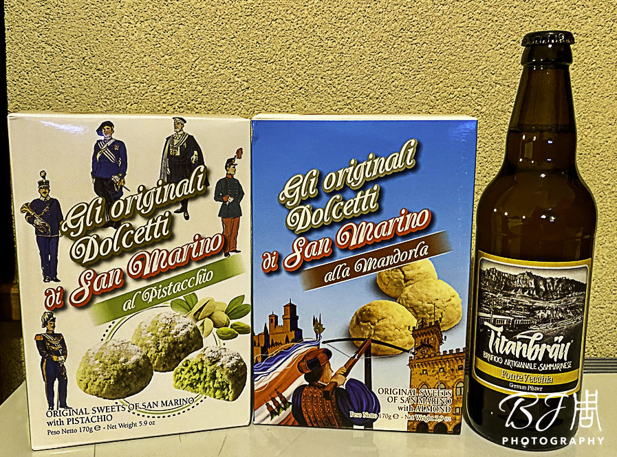 我這人喜歡吃零食,在聖馬利諾逛街時買了一點糖果餅乾,發現聖馬利諾自產的小餅乾不甜不硬特別好吃,價錢也不貴,包裝紙盒上印著他們穿著不同制服的警衛,很有意思。回頭買了四盒帶在路上解飢解饞,很快就在旅途中吃完了。